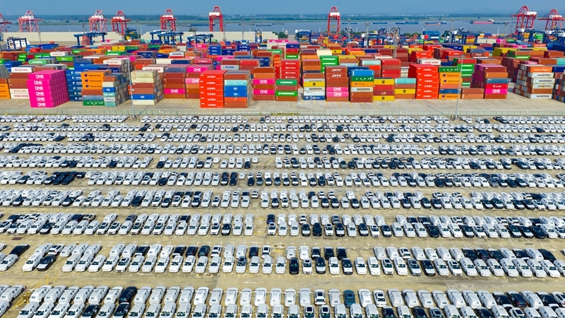 2025年10月4日在江苏省港口集团南京港龙潭港区拍摄的准备装船出口的汽车(无人机照片)。