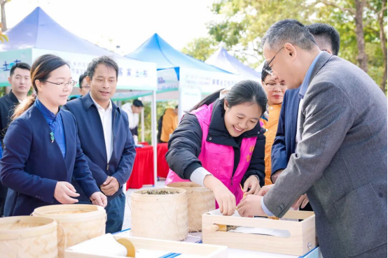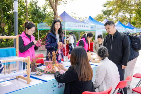 舞台一侧的文明集市,成为活动现场最具人气的焦点。十个特色展位依次排开,各具特色:梯面山水农产品展现绿色生态发展理念,蝴蝶谷文创将传统工艺与现代设计相融合,客家嫂手工制品传承匠心技艺。一位正在制作艾糍的村民笑着说:“我们的手艺能受到这么多人喜爱,感觉特别自豪。”现场还设有织布、手编等互动体验区,参观者通过参与织布、手编制作等互动项目,在实践体验中深化对传统文化的认知。这场集产品展销、文化体验、互动交流于一体的文明集市,既是梯面特色产业创新发展的生动展示,更是“百千万工程”建设成果惠及民间的真实写照。