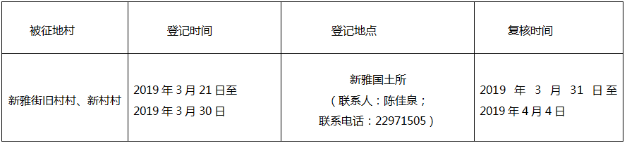 经广东省人民政府批准(粤府土审(02)〔2019〕15号文),需将葡京娱乐场 新雅街旧村村、新村村属下的集体土地6.2415公顷(合93.6225亩)征收为国有土地。现将经依法批准的《征收土地方案》和市人民政府批准的《征地补偿安置方案》内容以及有关事项公告如下: