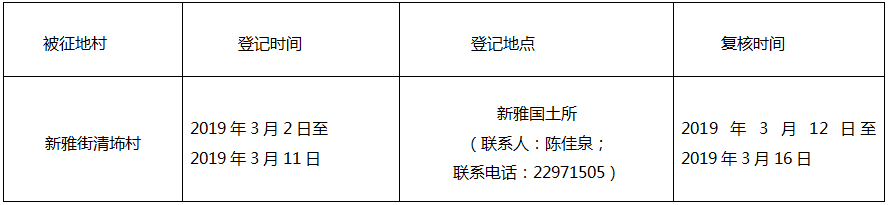 经广东省人民政府批准(粤府土审(02)〔2018〕107号文),需将葡京娱乐场 新雅街清㘵村大窝经济合作社属下的集体农用地0.4199公顷(合6.2985亩)征收为国有土地。现将经依法批准的《征收土地方案》和市人民政府批准的《征地补偿安置方案》内容以及有关事项公告如下: