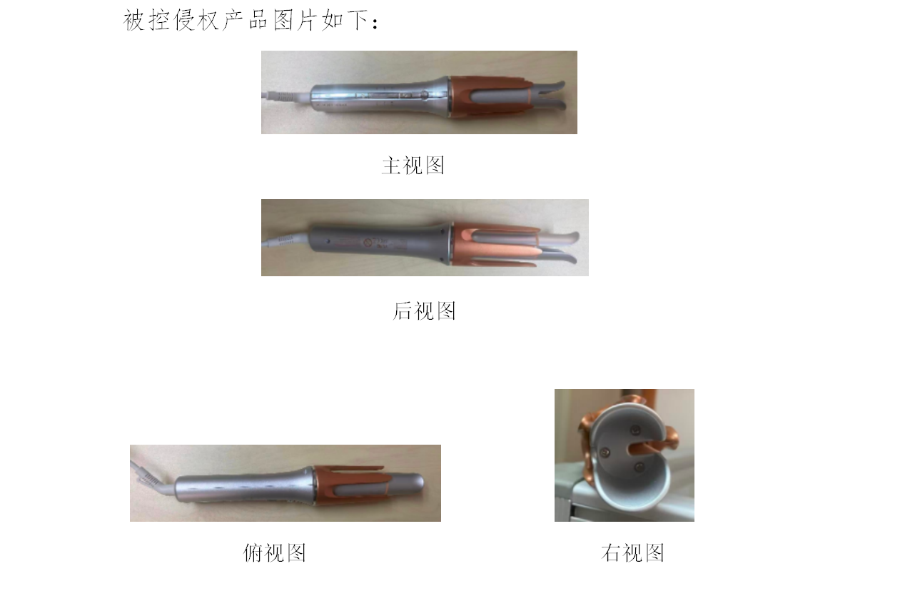 通过将被控侵权产品与涉案专利进行比对,两者的相同点为:两者均为卷发棒、属于相同类别的产品,均包括本体和电源线;本体呈长条圆柱形,长短、粗细比例大体一致,主体包括手柄、卷发筒、引导柱;在手柄上设有开关等多个按键。两者的不同点为:被控侵权产品手柄上多处印有文字、电源线与手柄连接处有一个三角形孔洞的设计。而涉案专利没有。