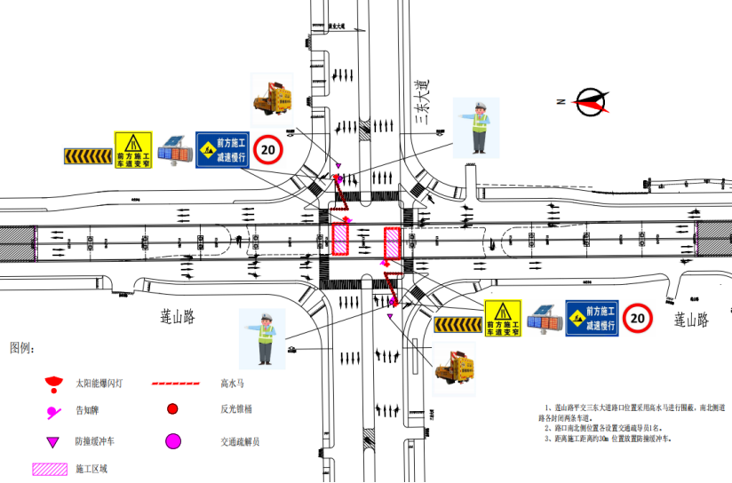 封闭莲山路平交三东大道路口处北侧2条车道、南侧2条车道。
