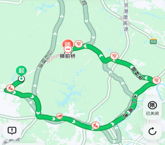 方案一:县道X308狮前路南——省道S381山前旅游大道——广连高速——大广高速——银林街——石吉街——檀香山街——大窿坳路——县道X308狮前路北(约35公里,46分钟)