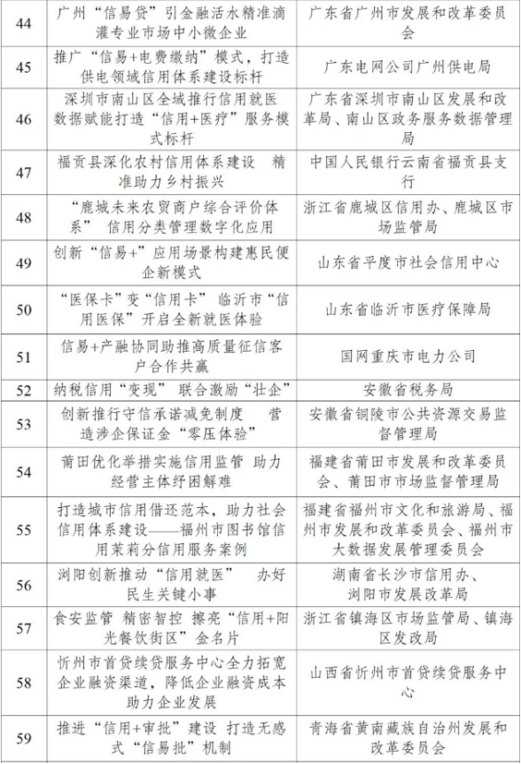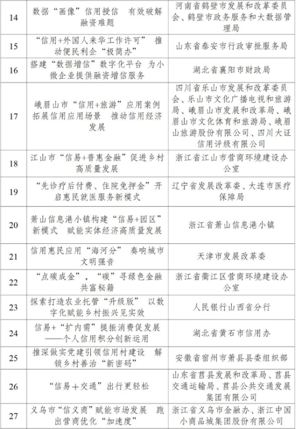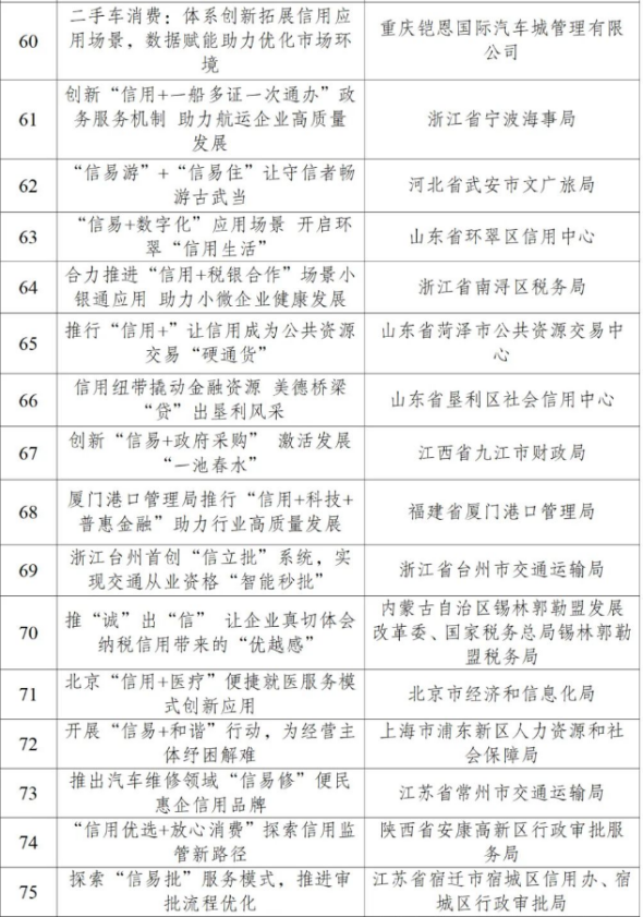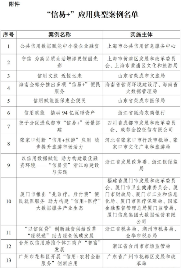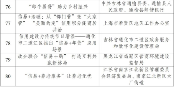 现向社会公开发布评选出的80个“信易+”应用典型案例名单,具体案例内容后续将进行展播,供各地方学习借鉴,复制推广典型做法和成功经验,引导经营主体树立诚信兴商经营理念,助力形成全社会“知信、守信、用信”的大格局,为构建新发展格局、推动经济社会高质量发展贡献力量。