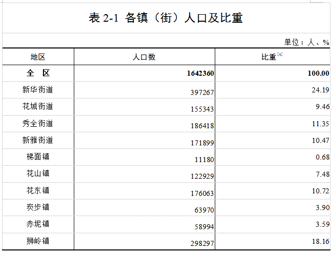 10个镇(街)中,人口超过30万人的镇(街)有1个,在20万人至30万人之间的镇(街)有1个,在10万人至20万人之间的镇(街)有5个,少于10万人的镇(街)有3个。其中,人口居前五位的镇(街)合计人口占全区人口比重为74.89%。