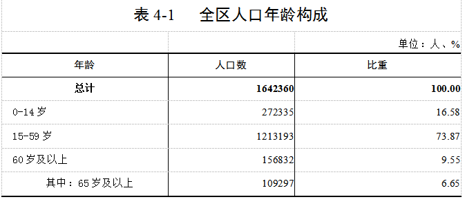 全区常住人口[2]中,0-14岁[3]人口为272335人,占16.58%;15-59岁人口为1213193人,占73.87%;60岁及以上人口为156832人,占9.55%,其中65岁及以上人口为109297人,占6.65%。与2010年第六次全国人口普查相比,0-14岁人口的比重提高4.52个百分点,15-59岁人口的比重下降4.70个百分点,60岁及以上人口的比重提高0.18个百分点,65岁及以上人口的比重提高0.45个百分点。