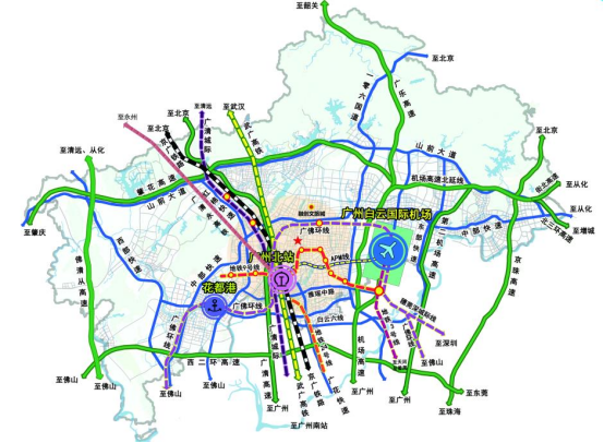 “十四五”末,空铁联运大综合交通体系建设取得重大进展,白云国际机场扩建及综合换乘枢纽基本建成,地铁和城际轨道交通建设初显成效,与机场联接的高速路、快速路、市政路建设稳步推进,基本实现空港与大湾区主要城市“1小时直达”,白云国际机场与广州北站“6分钟连接”。