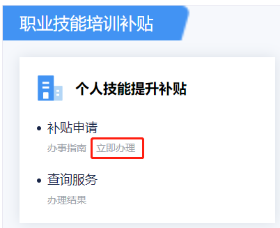 (二)在“事项办理”->“个人办事中心”->“个人技能提升补贴”->“补贴申请”->“立即办理”,按提示填写信息和上传申请资料,最后点击“提交”按钮。(办理进度可以在“立即办理”下面的“办理结果”查询)