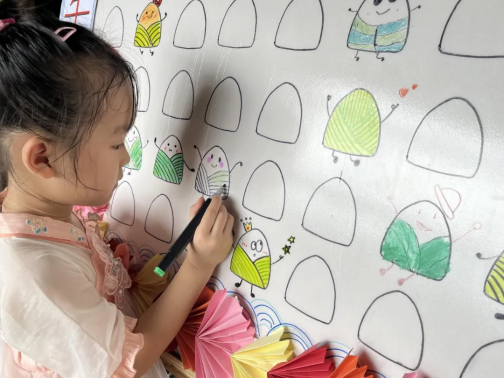 一到现场,孩子们就在签到墙上手绘创意粽子,以独特的方式签到,画出的粽子各有神态,有的唱歌、有的跳舞、有的玩耍……表达孩子们过端午节及参加活动愉悦的心情。