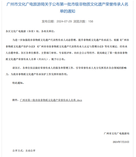2024年4月,广州市文化广电旅游局组织开展市级非物质文化遗产荣誉传承人推荐申报工作,经自主申报、各区推荐、专家组评审、社会公示等程序,认定10位市级代表性传承人为第一批市级非物质文化遗产荣誉传承人,我区市级非遗代表性传承人刘土金、谭秋荣入选。