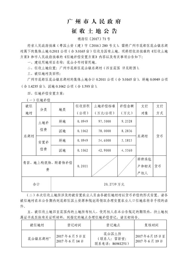广州市人民政府征收土地公告——穗府征〔2017〕71号