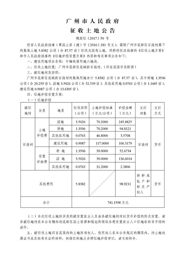 广州市人民政府征收土地公告——穗府征〔2017〕50号