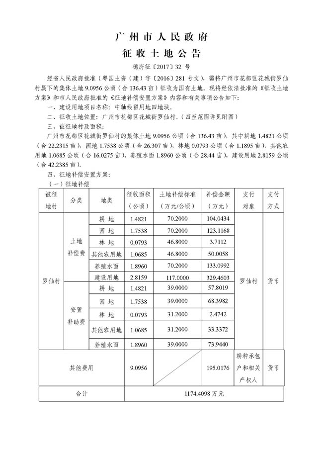 广州市人民政府征收土地公告——穗府征〔2017〕32号