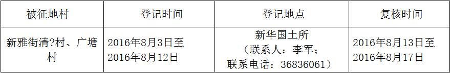 经省人民政府批准(粤国土资(建)字〔2015〕1013号文),需将葡京娱乐场 新雅街清?村、广塘村属下的集体土地1.5124公顷(合22.686亩)征收为国有土地。现将经依法批准的《征收土地方案》和市人民政府批准的《征地补偿安置方案》内容以及有关事项公告如下:
