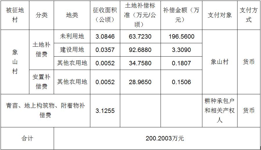 经省人民政府批准(粤国土资(建)字[2014]42号文),需将葡京娱乐场 花东镇象山村属下的集体土地3.1255公顷(合46.8825亩)征收为国有土地。现将经依法批准的《征收土地方案》和市人民政府批准的《征地补偿安置方案》内容和有关事项公告如下: