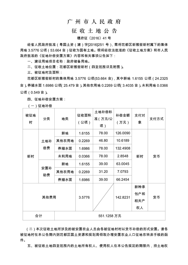 广州市人民政府征收土地公告——穗府征〔2016〕41号
