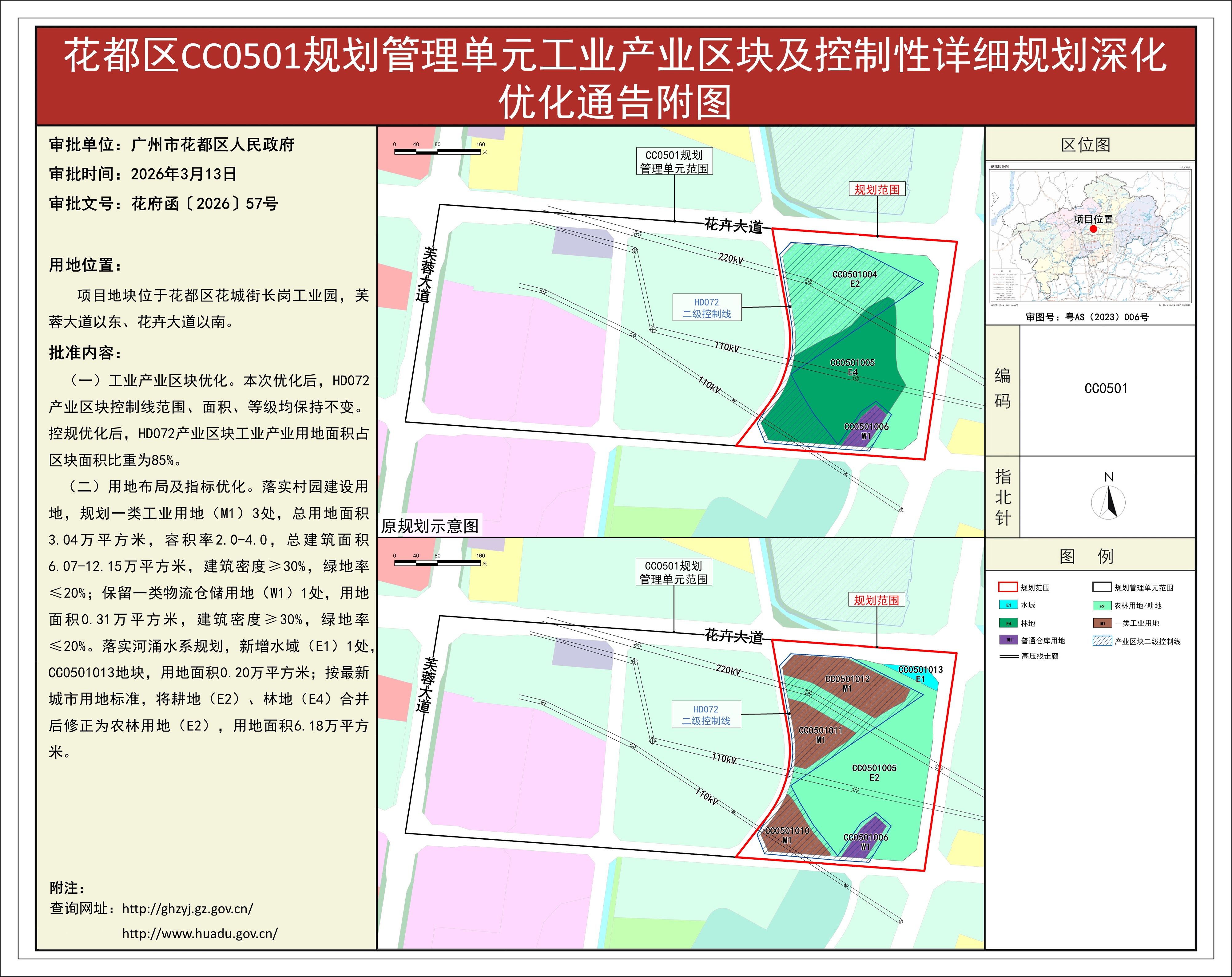 根据《广东省城市控制性详细规划管理条例》、《广州市人民政府关于将一批市级行政职权事项继续委托区实施的决定》(穗府〔2019〕8号)及《广州市人民政府关于收回一批市级行政权力事项的决定》(广州市人民政府令第188号)等文件有关要求,《葡京娱乐场 CC0501规划管理单元工业产业区块及控制性详细规划深化优化》规划成果已经葡京娱乐场官网 批准(花府函〔2026〕57号),自批准之日(2026年3月13日)起生效。